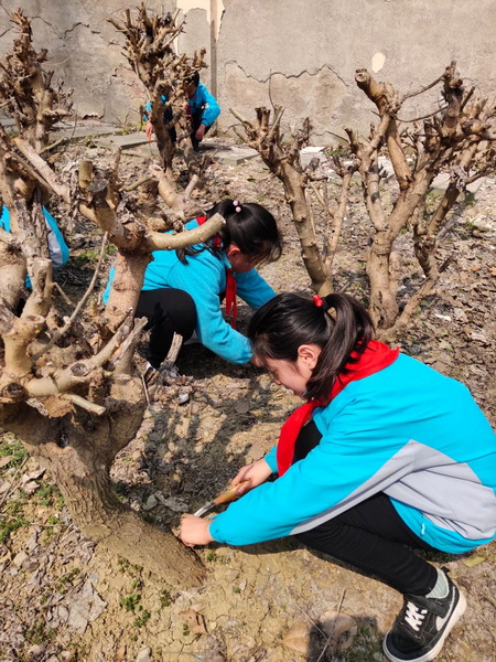 少先队员在桑树地里除草、施肥、松土....把这里当成劳动实践的乐园。